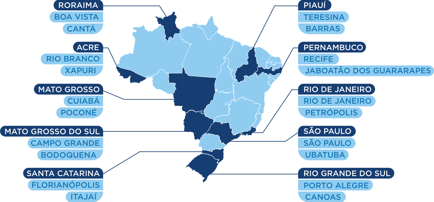 Clima, Municípios e Evidência: O CliMunE é uma iniciativa de pesquisa que investiga como os municípios brasileiros podem aprimorar suas respostas a eventos climáticos extremos através de políticas baseadas em evidências. A pesquisa abrange 10 estados escolhidos para garantir diversidade geográfica, ecológica e institucional: Acre e Rondônia (região Norte), Pernambuco e Piauí (região Nordeste), Mato Grosso e Mato Grosso do Sul (região Centro-Oeste), Rio de Janeiro e São Paulo (região Sudeste), e Rio Grande do Sul e Santa Catarina (região Sul).